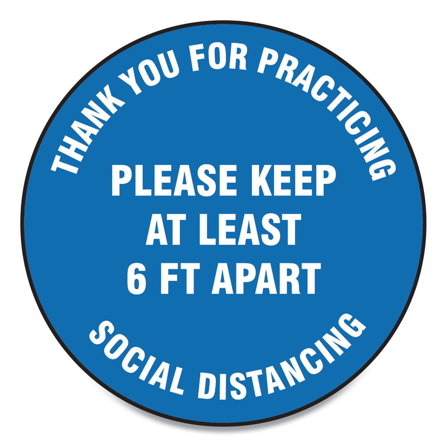 Alert and remind visitors, customers, and employees to practice social and physical distancing to prevent the spread of COVID-19, the Coronavirus. Constructed of thick adhesive vinyl. Subsurface printed and laminated to protect the graphics and message from heavy pedestrian traffic. Non-slip, pebble-textured surface provides added durability. Strong, permanent, acrylic adhesive back with peel-off liner. Adheres firmly to smooth, clean, dry surfaces. Size: 17" dia; Message(s): Thank You For Practicing Social Distancing Please Keep At Least 6 Ft Apart; Material(s): Slip-Gard Adhesive Vinyl; Orientation: Portrait.