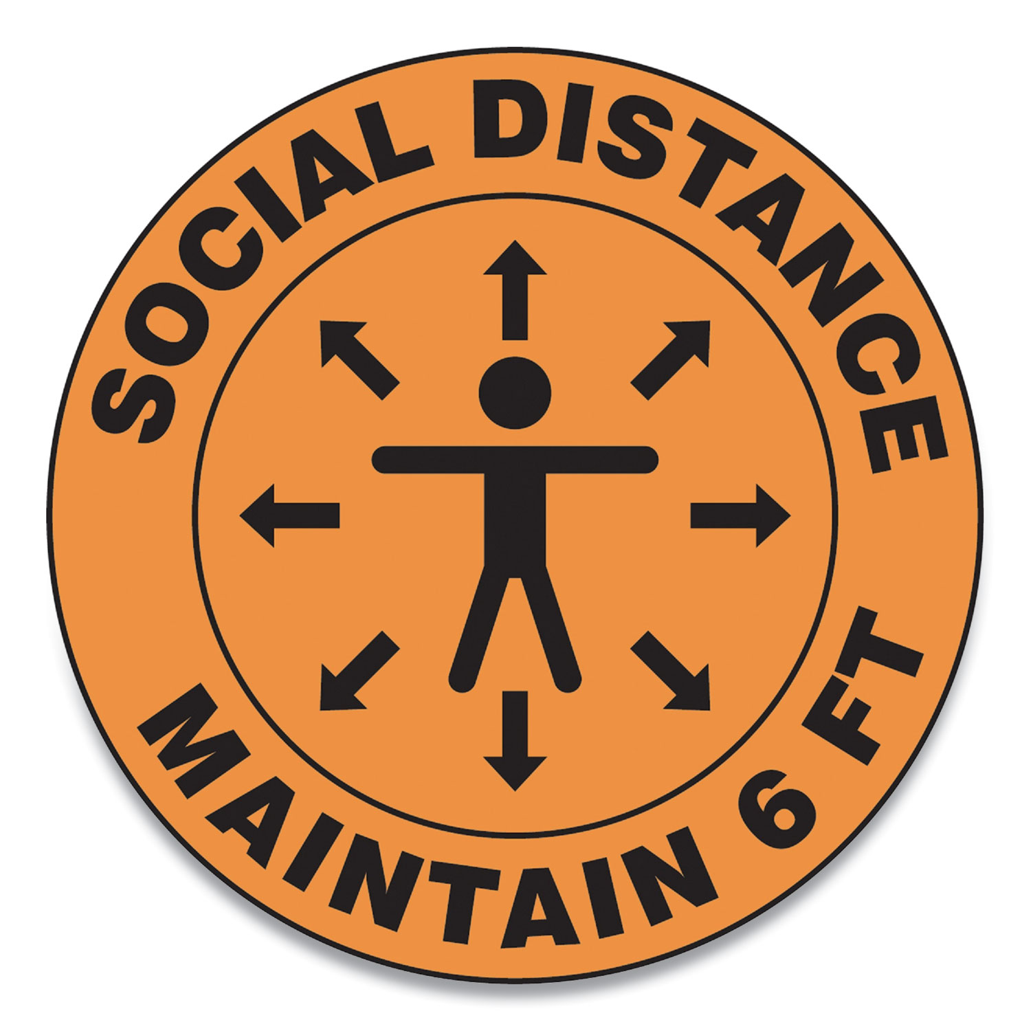 Alert and remind visitors, customers, and employees to practice social and physical distancing to prevent the spread of COVID-19, the Coronavirus. Constructed of thick adhesive vinyl. Subsurface printed and laminated to protect the graphics and message from heavy pedestrian traffic. Non-slip, pebble-textured surface provides added durability. Strong, permanent, acrylic adhesive back with peel-off liner. Adheres firmly to smooth, clean, dry surfaces. Size: 17" dia; Message(s): Social Distance Maintain 6 Ft; Material(s): Slip-Gard Adhesive Vinyl; Orientation: Portrait.