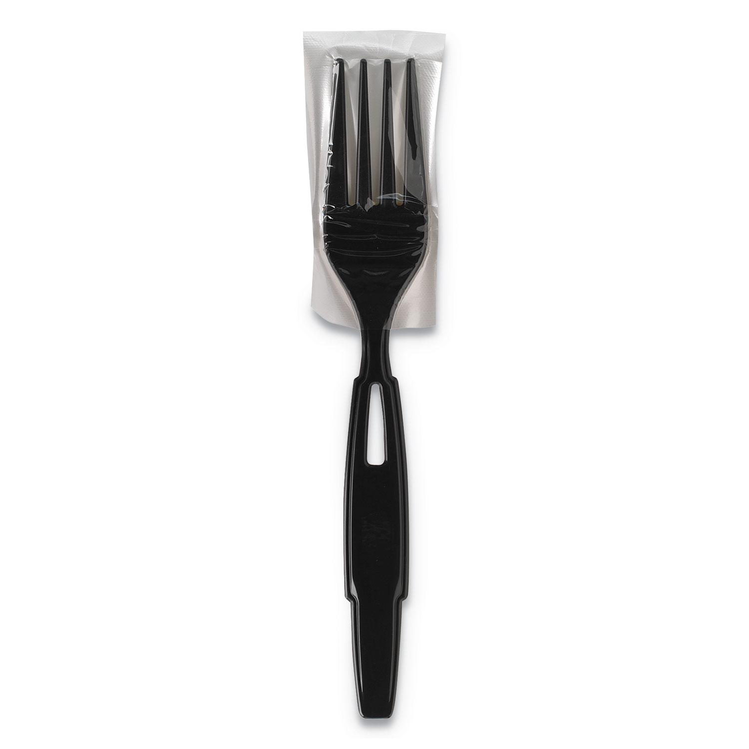 Durable and elegant full-size utensils help you promote an upscale image. Break-resistant, these full-length utensils offer excellent value without sacrificing performance. Pre-counted and pre-assembled refills make restocking fast and easy. Utensils Type: Fork; Material(s): Polypropylene; Color(s): Black; Grade: Heavyweight.