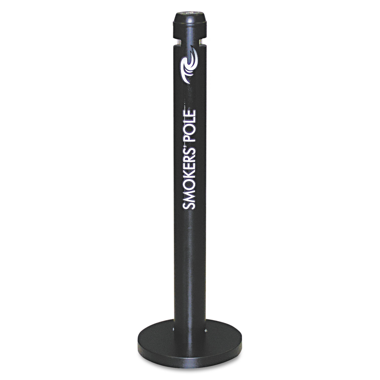 The Rubbermaid Commercial Aluminum Smokers Pole reduces obstruction in high-traffic areas. The round, vertical design is simple, yet sure to stand out in the vicinity for your patrons cigarette disposal needs. This weather-resistant ash tray features a UV-stabilized Uni-Koat powder-coated finish with a classic black color, making it suitable for a variety of outdoor environments. Made of durable aluminum, this cigarette bin is fire safe. Its chamber restricts oxygen flow, quickly extinguishing discarded smoking items, while its recessed extinguishing screen prevents extra ashes from dropping to the ground. These Smokers Poles feature simple mechanisms for emptying and maintenance, and no tools are required. A quick release push button detaches around the pole's midpoint for minimal bending. With a unique design and clean appearance that is covered to conceal waste, your patrons can easily deposit their cigarettes. Capacity (Volume): 0.9 gal; Material(s): Steel; Color(s): Black; Finish: Powder Coat.