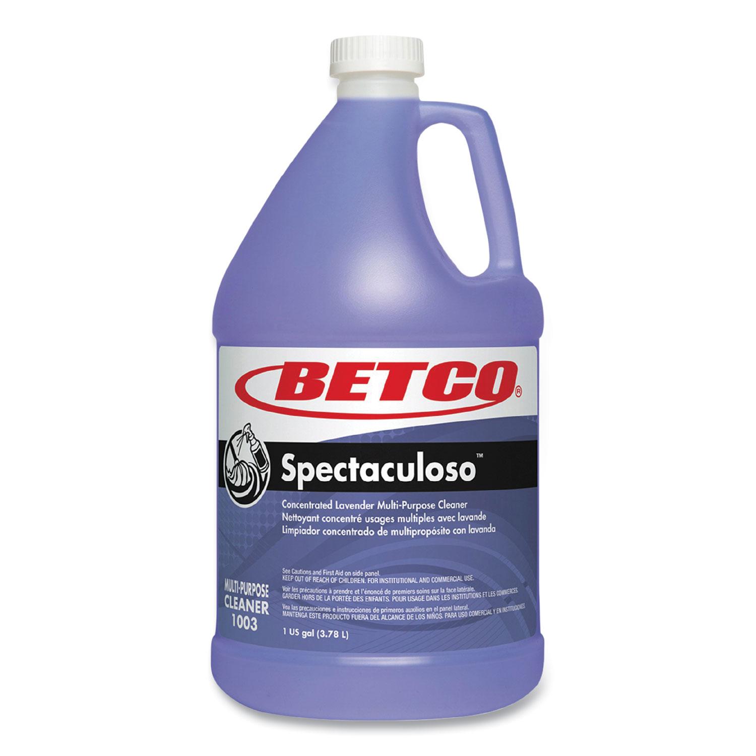 This all-purpose cleaner concentrate cleans and deodorizes most water-washable surfaces. Rinse-free, effective in hard water and will suspend the toughest soils. Spectaculoso can be applied in an auto scrubber, mop and bucket, or with a spray or sponge. Application: All-Purpose; Applicable Material: Ceramics; Enamel; Fiberglass; Finished/Sealed Wood; Glass; Laminates; Plastic; Chemical Compound: C9-11 Alcohols Ethoxylated; Butoxydiglycol; Sodium Laureth Sulfate; Tetrasodium EDTA; Scent: Lavender.