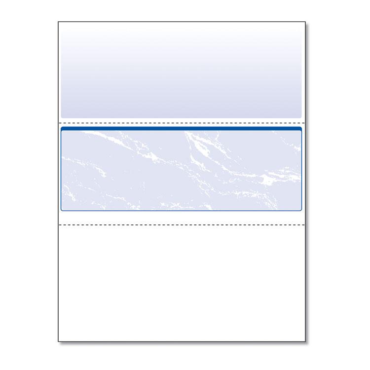 Incorporates security features recommended by the National Check Fraud Center. Compatible with most money management software programs. Security features include: Check-21 compliancy, "VOID" pantograph on the front and back, erasure-resistant background, security warning, anti-splice backer, security features listing, watermark, check verification number, patterned background and microtext print. Standard Marble Middle Check. Sheet/Roll Size: 8.5 x 11; Paper Basis Weight (lb): 24 lb; Paper/Media Color(s): Blue Marble; Color Family: Blue.