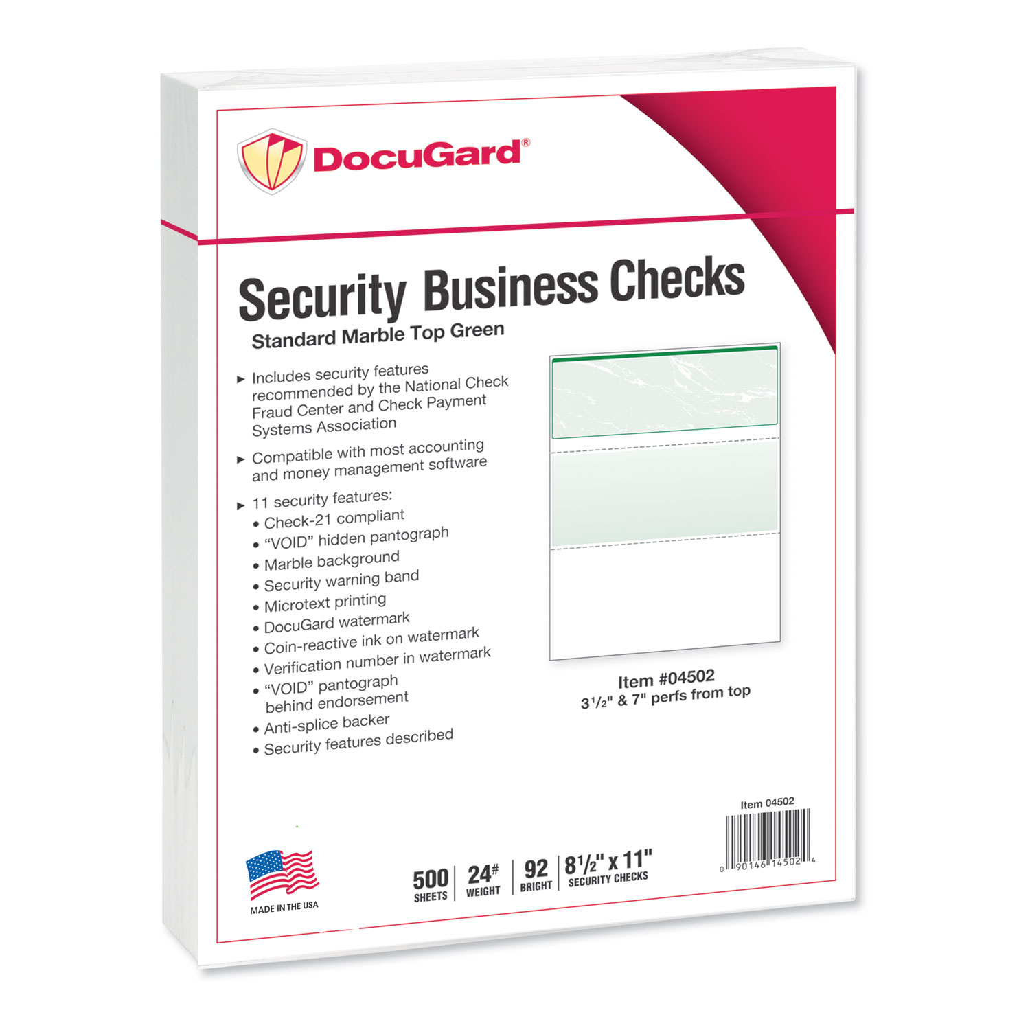 Incorporates security features recommended by the National Check Fraud Center. Compatible with most money management software programs. Security features include: Check-21 compliancy, "VOID" pantograph on the front and back, erasure-resistant background, security warning, anti-splice backer, security features listing, watermark, check verification number, patterned background and microtext print. Standard Marble Top Check. Sheet/Roll Size: 8.5 x 11; Paper Basis Weight (lb): 24 lb; Paper/Media Color(s): Green Marble; Color Family: Green.