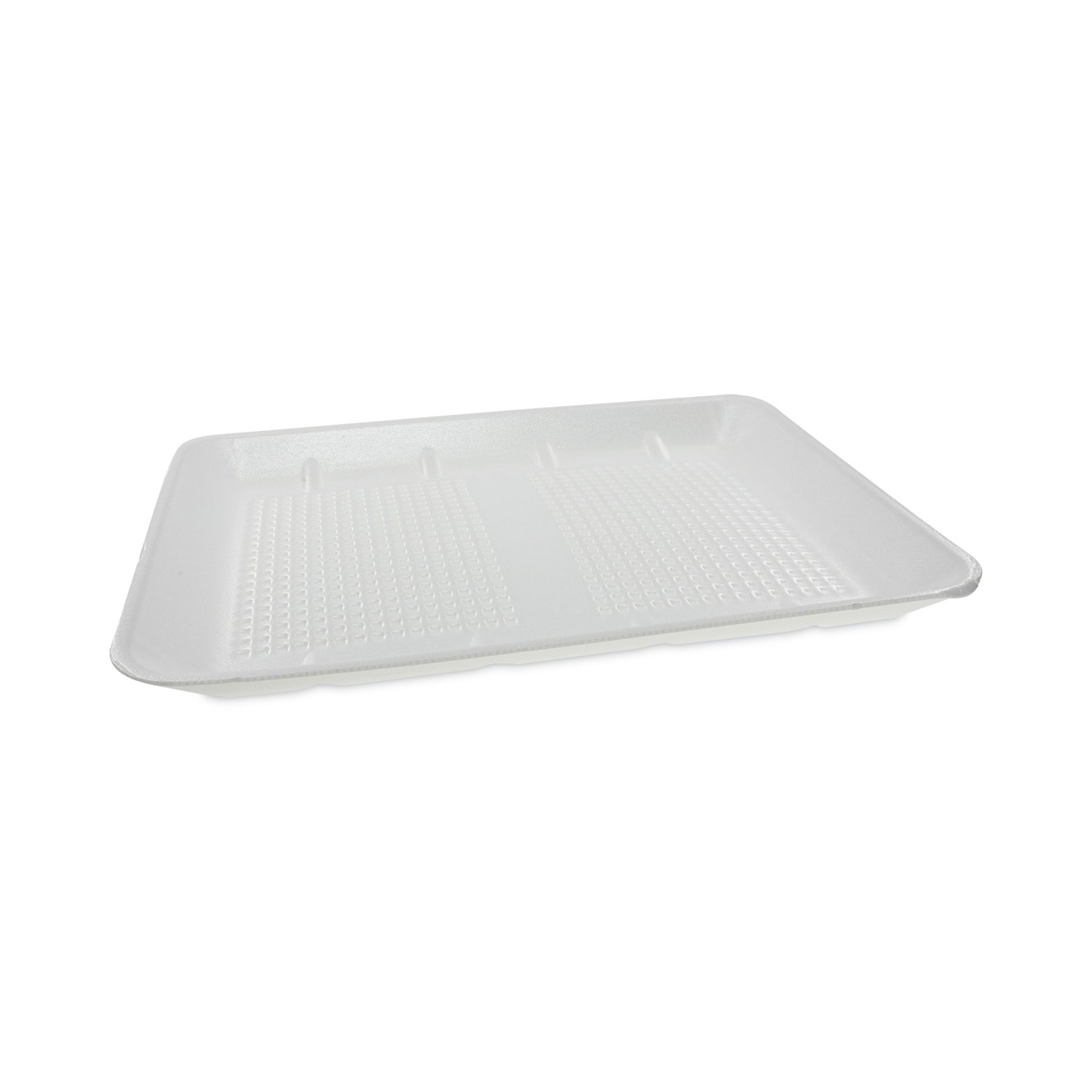 Sturdy, lightweight foam trays. Can be used in blast freezer, refrigerator, for a heated display or at room temperature. Rigid construction stands up to rugged handling. #1014 Family Pack Tray. Food Container Type: Supermarket Tray; Material(s): Polystyrene; Color(s): White; Width: 13.88".