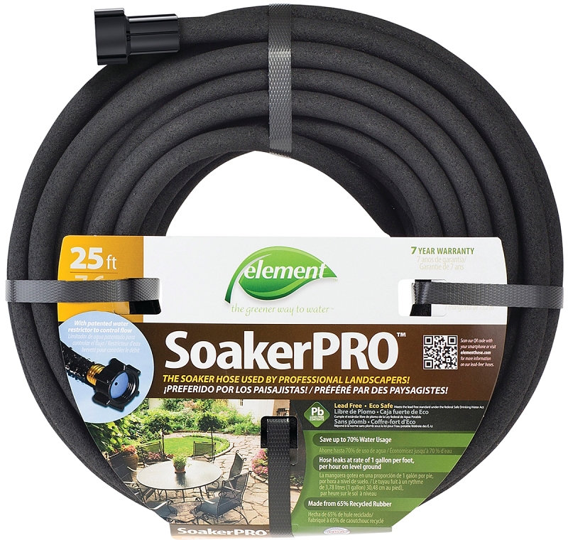 Lead-fee eco-safe hose. Saves up to 70% water usage. Patented water restrictor to control flow. Hose leaks at rate of 1 gal/ft/hr on level ground. Made from 65% recycled rubber. The soaker hose used by professional landscapers. 6/Pack.