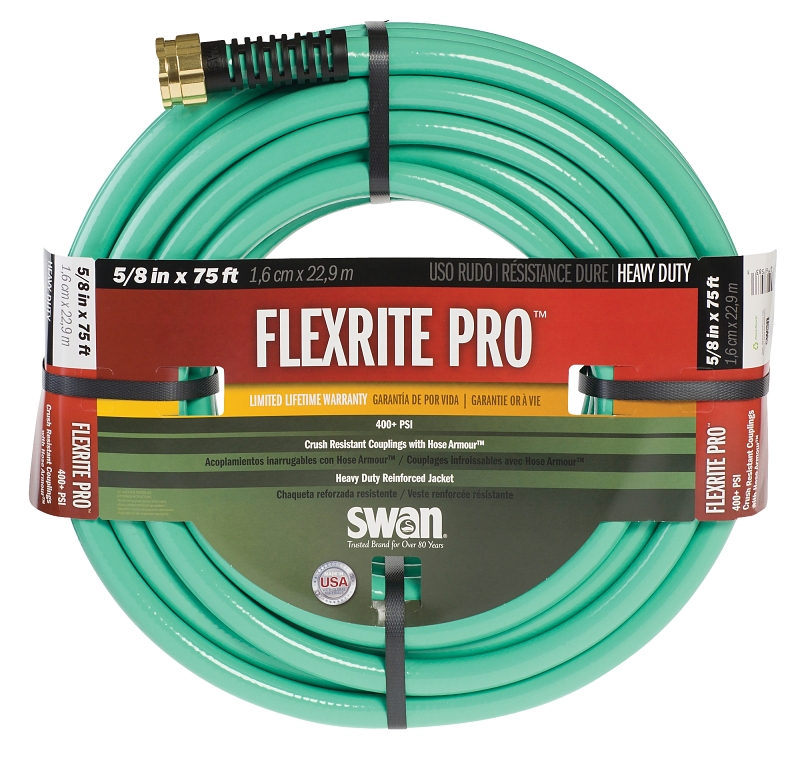 SWAN Flexrite Pro 75 ft 5/8 in heavy-duty flexible garden hose is an ultra-durable hose that can be used for both residential gardening and commercial applications. Among other features, this 75 ft flexible hose has outstanding kink resistance characteristics and burst performance of 400 psi. A scuff-resistant reinforced jacket reduces exterior wear and tear that is usually caused by its everyday use and the jacket significantly increases the hose's life. The male end of the hose features an octagon-shaped nut that easily attaches to a sprinkler or one of our spray nozzles. The female end of this 75 ft. Heavy-duty garden hose has crush-proof couplings that are tough enough to withstand damage that can be caused when the hose is run over by heavy equipment. Impressive technical characteristics of this 75 ft flexible garden hose make it a best choice for landscapers, contractors and other professionals.