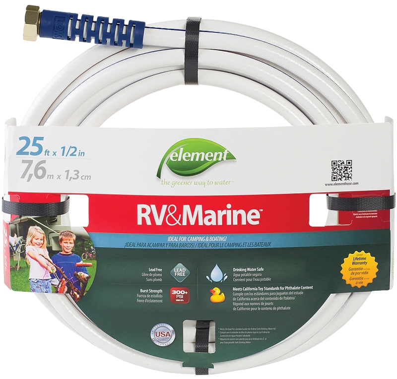 This 25 ft 1/2 in RV and marine drinking water hose is designed for a variety of applications when you are on the boat or a road trip. The 300 psi burst strength will ensure that you can use a strong water flow for a variety of tasks, whether you need to rinse off the dirt and stains from the deck of your yacht or quickly fill up the drinking water tank. This drinking water hose is lead- and phthalate-free and the water supplied from it doesn't have any additional odors or chemical tastes. As with any other drinking water hose, we recommend that for the best results you rinse the hose from inside with 1 to 2 gal of water before the first use. With a 1/2 in Dia octagonal female coupling, it will fit most standard water supply sources and the patented Hose Amour will protect it from breaking at the connection. Both the female and the male couplings are made with lightweight durable aluminum and designed to withstand accidental damage. With only 2.54 lb of weight and great flexibility characteristics, this RV and marine water hose is easy to carry, store and transport.