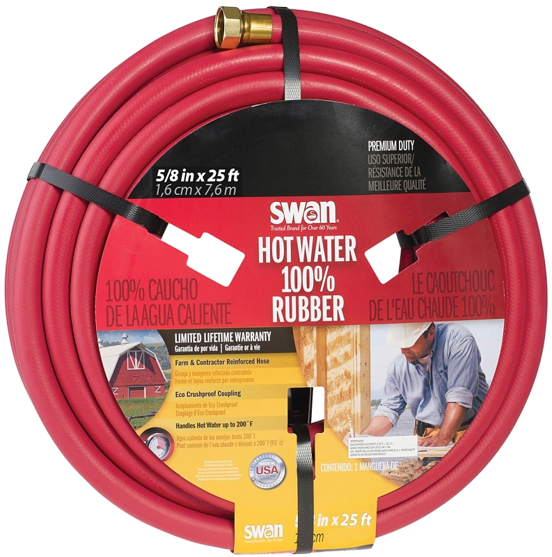 Do you need a garden hose rated for hot water. The MAXLite hot water rubber+ hose was specifically engineered to tackle hot water jobs of all sizes. It can handle temperatures from -40 deg F up to 165 deg F, making it suitable for a wide range of environments. Make no mistake, however: this is a heavy-duty 5/8 in hot water hose that is designed for commercial applications. Its owners love the fact that the hose is 40% lighter and twice as strong as other conventional hoses. You won't have to struggle with this hot water rubber hose to complete your jobs and projects. A 50 ft hot water hose gives you plenty of length and the crushproof aluminum couplings on each end of the hose can endure heavy use. The 400 psi of burst strength makes this a popular SWAN hot water garden hose. It's also compliant with the federal safe drinking water act, so you'll have more peace of mind when you use the hose around the house.