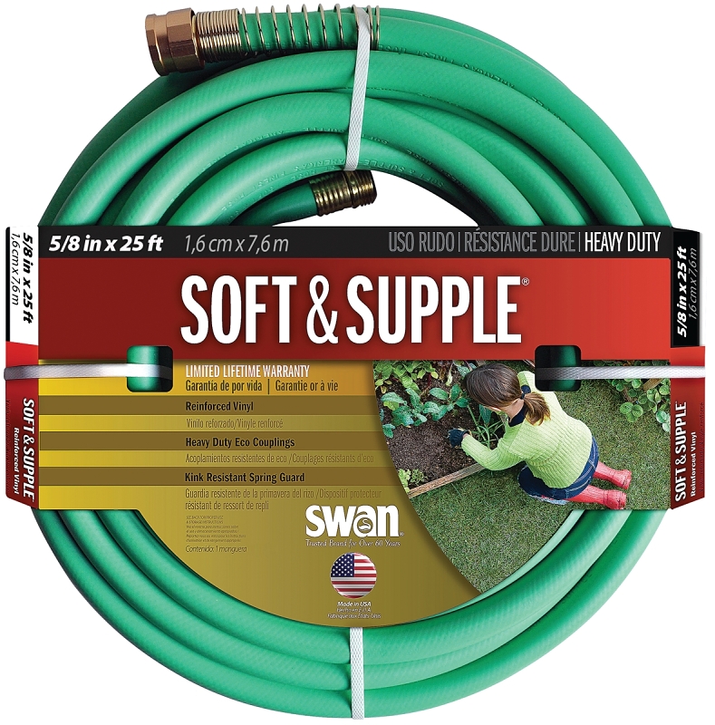 Extra-tough, 5-ply construction with soft-textured, abrasion-resistant cover and Seal-Tite leak-proof brass coupling. Dual reinforced, offers heavy-duty flexibility and kink resistance by combining durability of rubber with easy handling of vinyl.