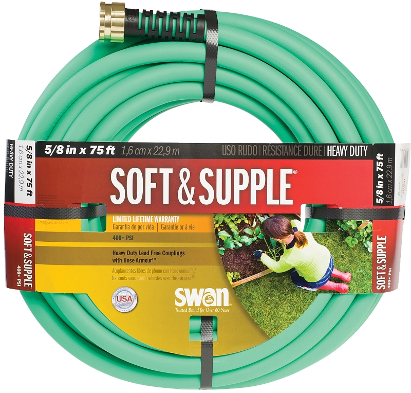 The SWAN soft and supple 75 ft 5/8 in water hose combines flexibility and strength. Say goodbye to twisted hoses with this 75 ft flexible garden hose. It can be stretched around the garden with ease and the abrasion-resistant cover of the hose means you'll be using this one for many seasons. The crush-proof aluminum couplings on this flexible garden hose of 75 ft. In L are lead-free and afford maximum protection. You won't have to worry about them being damaged when they are stepped on or run over by light garden equipment. This is a hose made for large outdoor areas. It boasts an amazing 400 psi burst strength that will give you great coverage. Made with pride in the USA, the 75 ft. Flexible hose from SWAN's is functional and versatile. From watering the lawn to hosing down the deck, this hose does it all.