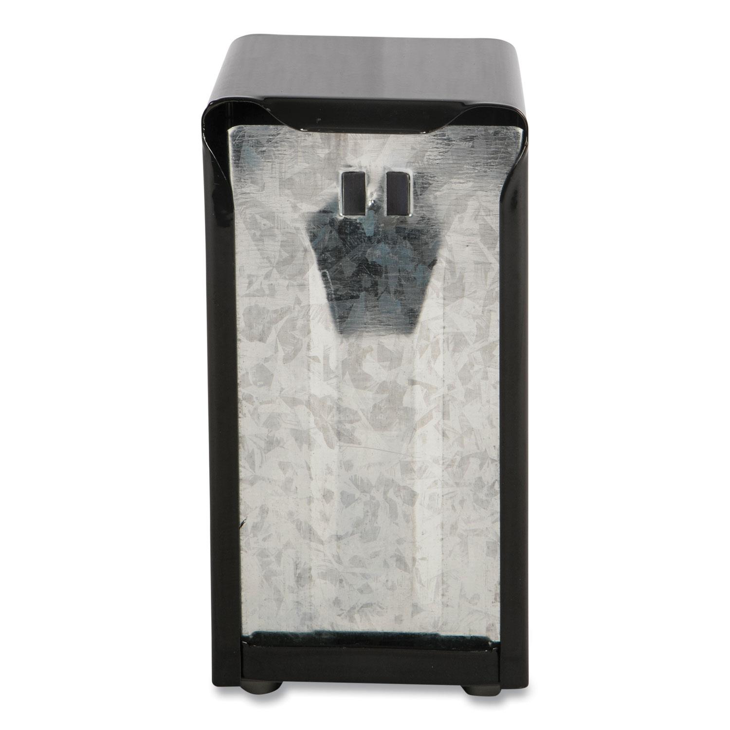 Easy-loading, two-sided napkin dispenser. 22-gauge stainless steel construction. Presents a professional image to patrons and provides easy access to napkins at each table. Color(s): Black; Width: 3 3/4"; Depth: 4"; Height: 7 1/2".