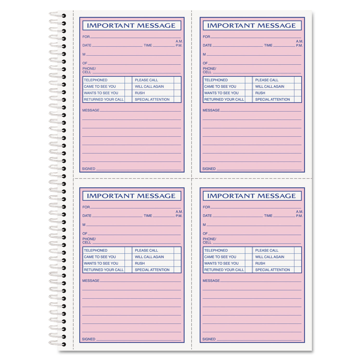 Quick check-off style with special area for fax and mobile phone numbers. Space for important phone numbers. Two-part carbonless copies remain in book as permanent record. Form Size: 5 1/2 x 3 7/8; Forms Per Page: 4; Form Quantity: 200; Sheet Size: 8 1/2 x 11.