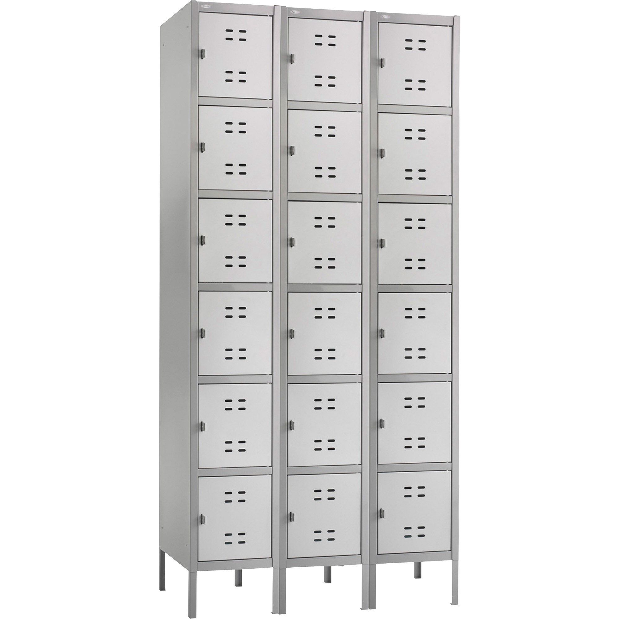 Heavy gauge, all-steel construction and strong uni-body design stand up to tough conditions. Raised 6" off the floor for easier access and perforated for ventilation. Padlock clasp for security. Fully assembled units can be linked together for greater capacity. Three Lockers. Color: Two-Tone Gray; Overall Width: 36"; Overall Depth: 18"; Overall Height: 78".