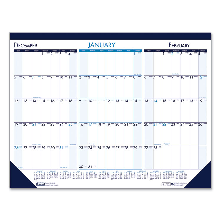 A unique desk pad calendar that has a three-month view to plan ahead and look back all at once. Includes 12 pages with prior, current and future months. The pages are stitched at the top with blue leatherette binding and matching reinforced corners for durability throughout the year. Each page is perforated at the top for easy tear-off as needed. Holiday dates printed in light blue to stand out. Made entirely of recycled materials. Size: 22 x 17; Page Color/Theme: Blue/Teal; Edition Year: 2020-2022; Calendar Term: 14-Month (Dec-Jan).