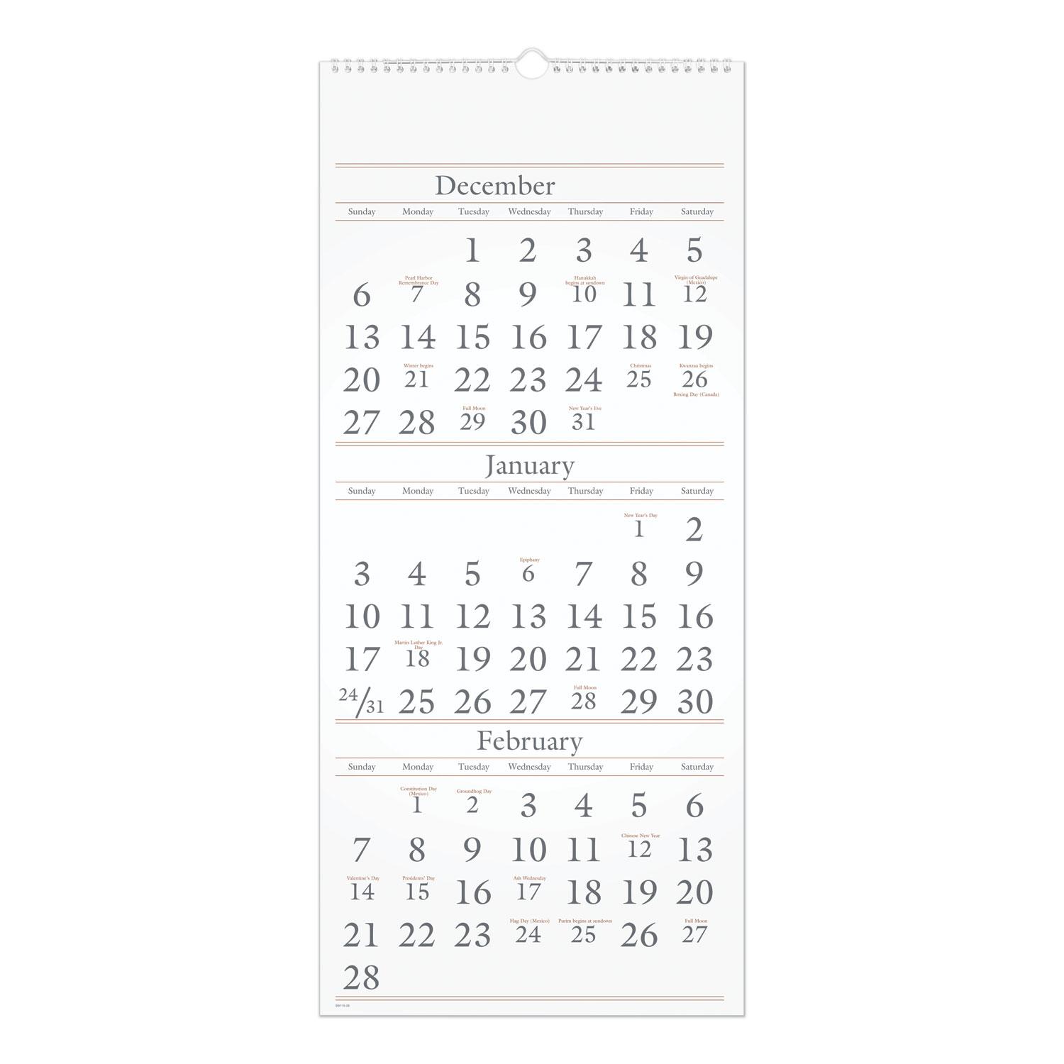Vertical format calendar fits easily in compact spaces. Quality buff paper. Three months per page: past, current and future months. Large, easy-to-read numbers. Federal holidays highlighted. Chipboard backing; white wirebound with hanging loop. Printed on high-quality paper with superior ink bleed resistance. Size: 12 x 27; Page Color/Theme: White; Edition Year: 2020-2022; Calendar Term: 15-Month (Dec-Feb).