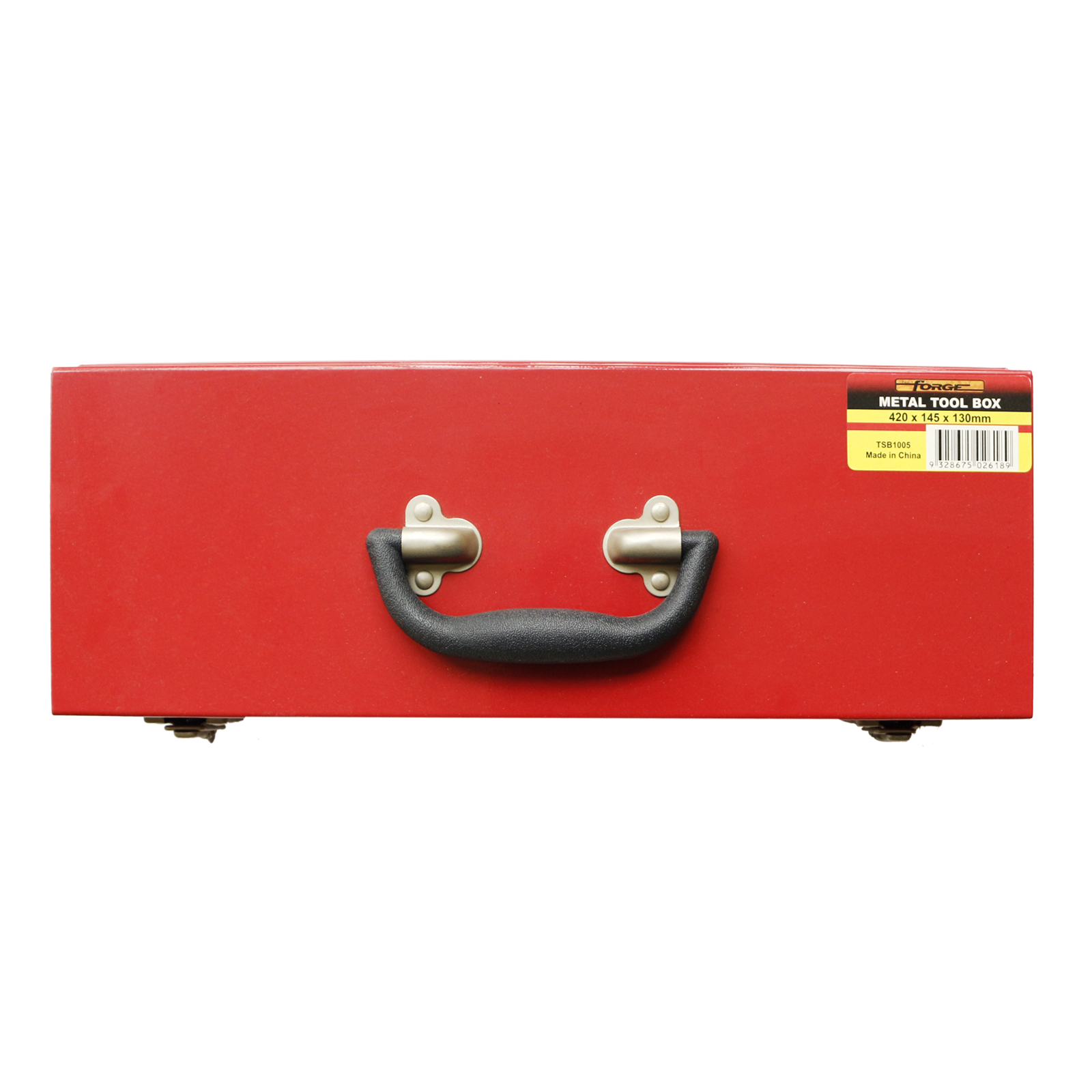 Portable steel tool box with full-length piano hinge, two latches, and powder-coat paint finish.