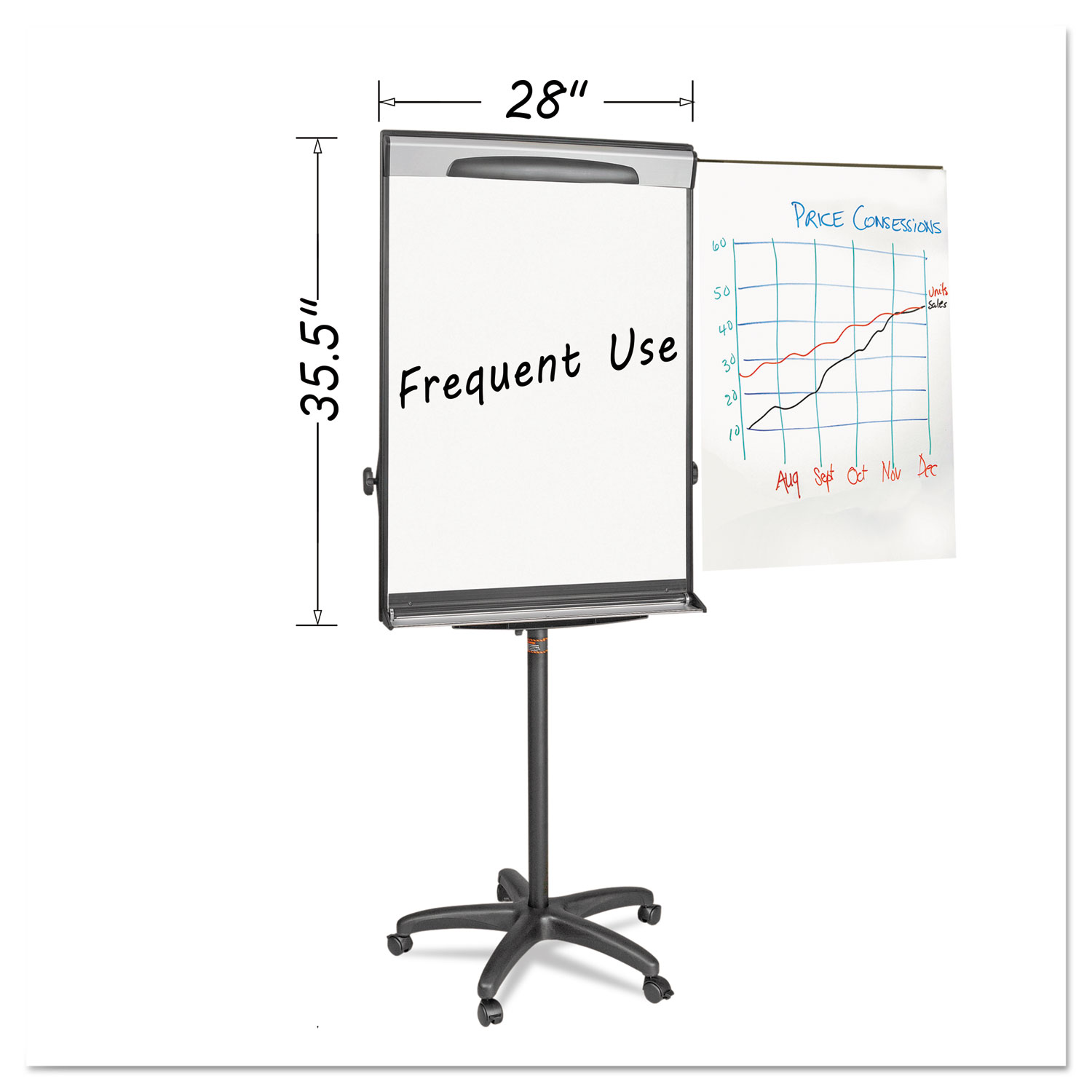 Use as a tabletop or floor-standing unit. Steel magnetic dry erase surface stands up to frequent use. Adjustable clips accommodate any size easel pad while two magnetic extension bars allow you to present up to three sheets of paper at a time. Folds flat for easy storage. Pen tray for writing instruments. Easel Type: Presentation; Minimum Easel Height: 69"; Maximum Easel Height: 78"; Folded Size: 42 x 30.