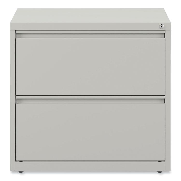 Drawers with side-to-side hang rails to accommodate letter/legal hanging files. Full drawer extension on steel ball bearing telescoping slide suspension. Stylish full-width radius edge recessed pulls. Anti-tipping interlock system allows only one drawer to open at a time. Single key core removable lock with two keys. Two-Drawer. Color: Light Gray; Color Family: Gray; Overall Width: 30"; Overall Depth: 18".