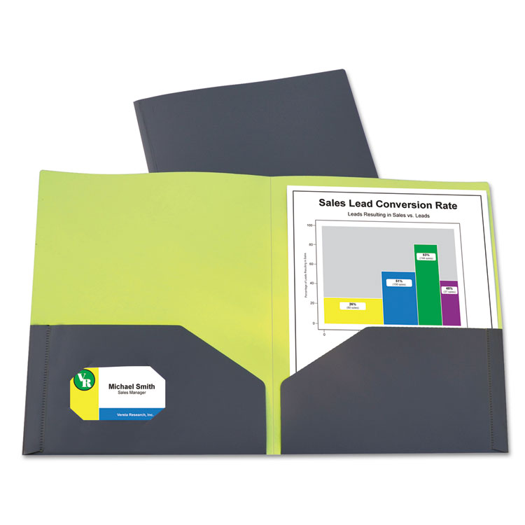 Sophisticated two-pocket folders hold presentations and proposals. Keep track of letter-size documents by organizing them in these durable portfolios. Stylish two-tone material features an eye-catching mirror finish exterior and subtle matte finish interior. Super heavyweight poly material resists tearing. Features business card slot on front inside pocket. For 8 1/2" x 11" materials. Front Cover Color(s): Charcoal Gray/Lime Green; Color Family: Gray; Back Cover Color(s): Charcoal Gray/Lime Green; Sheet Size: 8 1/2" x 11".