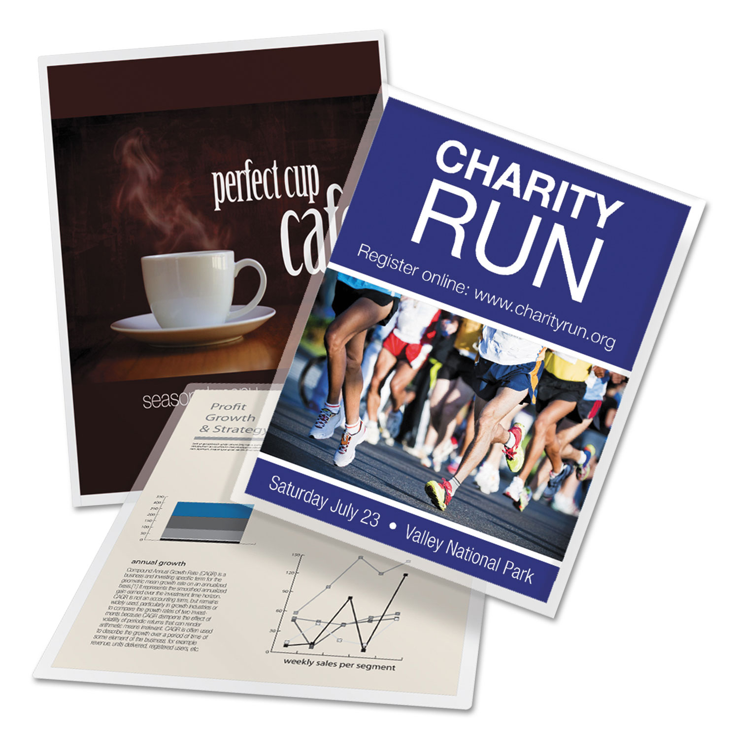 Thermal laminating pouches provide a clean and crisp look for professional results. Brilliant clarity shows off the details of text and colors in images. Laminator Supply Type: Thermal Lamination; Supply Format: Pouch; Suggested Applications: Document; For Use With: Thermal Laminators.