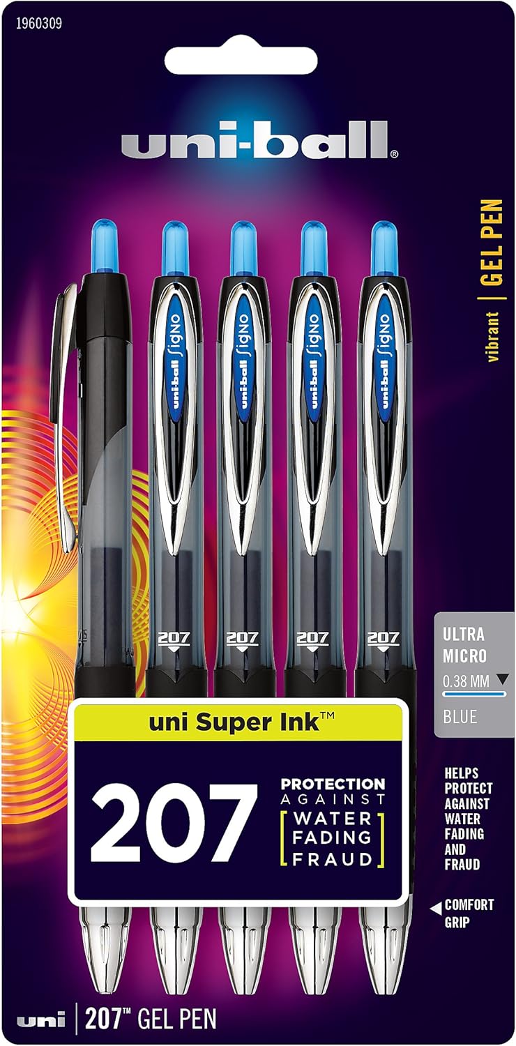 Uniball Signo 207 Gel Pen 5 Pack, 0.38mm Ultra Micro Blue Pens, Gel Ink Pens