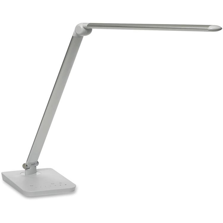 Stylish and functional LED lights feature a multi-pivot flexible neck creating just the right light for every work project. Going one step further, these lights have a USB port in the back of the base giving users the option to recharge digital devices. With an eight-step touch dimming function that includes warm or cool light settings, the lamp allows users to decide the amount of light in their space. Base Color: Silver; Plug Type: 2 Prong; Height: 16.75"; Width: 5".