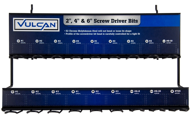 The Vulcan screwdriver bit 2 tier rack has 18 slots. This is the perfect rack to keep your products organized on the shelf.