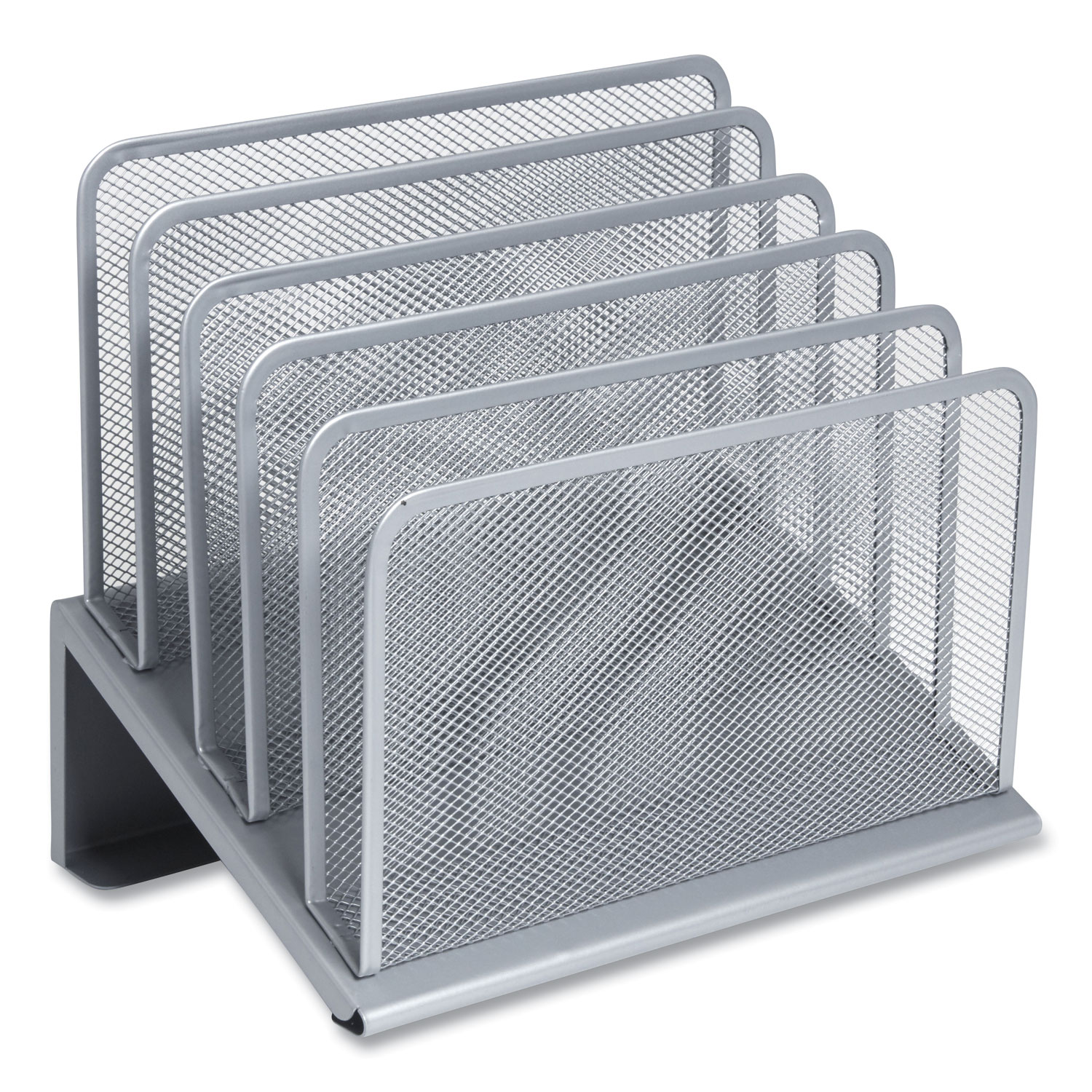 Reduce clutter and improve the overall appearance of your workspace. Inclined design and staggered openings accommodate paper pads, file folders, forms, documents and large-format envelopes. Tightly woven metal-mesh body and a sleek, flat-square frame with rounded edges deliver reliable performance with a contemporary, professional flair. Open DesignIntegrated feet for stability and worksurface protection. Number of Compartments: 5; For File Size: Letter; Load Orientation: Top; Color(s): Silver.