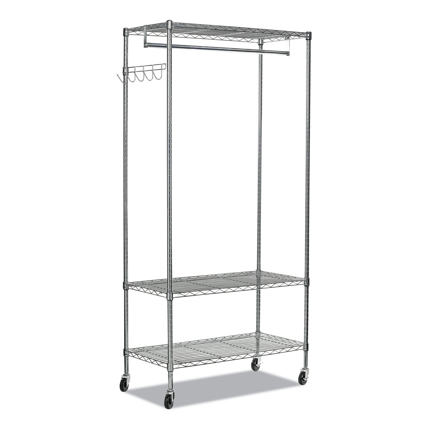 Time-saving design assembles in minutes without tools. Strong welded wire construction that allows air circulation and helps reduce dust buildup. Double-sided for quick access to items. Rack features hanging rod for garments, five support hooks for umbrellas, bags, and other items to accommodate your needs. Three shelves adjust in 1" increments and support 350 lbs. on each shelf. Four casters for quick mobility and two lock when it has reached your destination. Total unit capacity is 500 lbs. if used with casters. Hangers not included. Mounting: Stand Alone; Width: 48"; Depth: 18"; Height: 75".